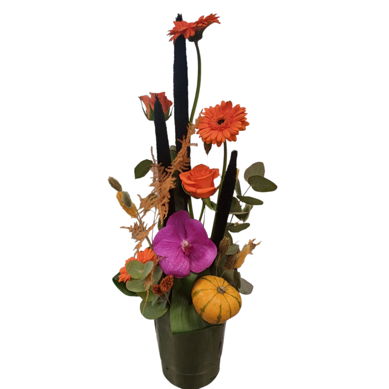 Craquez pour ces couleurs d'automne, cette composition est piquée dans de la mousse hydrophile, un verre d'eau tous les 2-3 jours est important pour maintenir la fraicheur des fleurs.