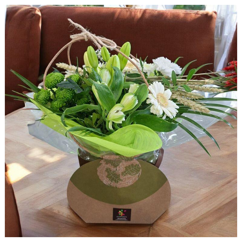 Joli et pratique, ce bouquet blanc et son p'tit sac kraft décoreront parfaitement tous les interieurs.
