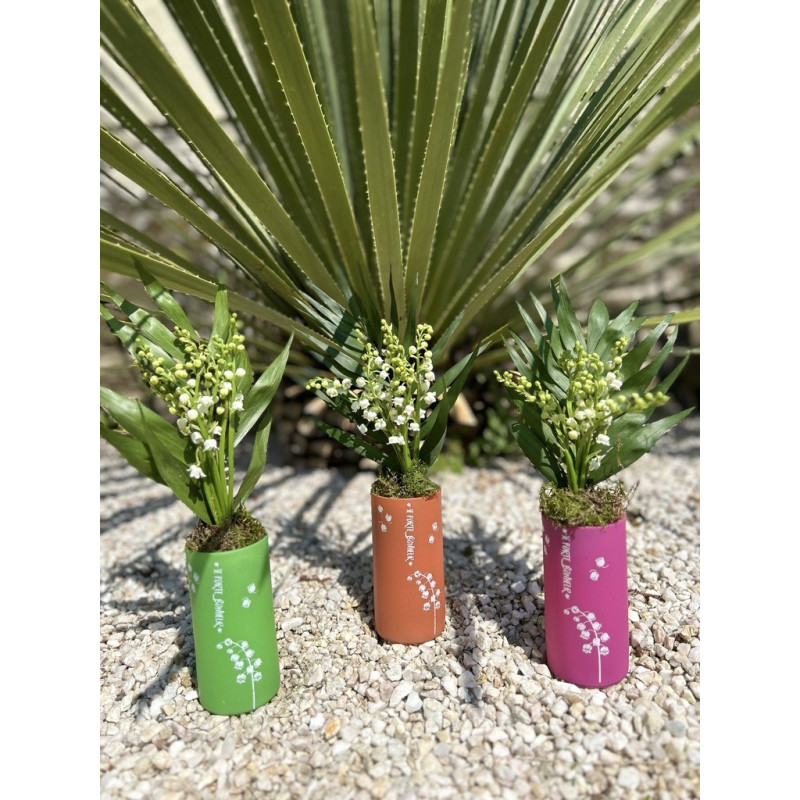 Un bouquet de 7 brins de muguet et 1 rose, avec leur vase en verre assorti.